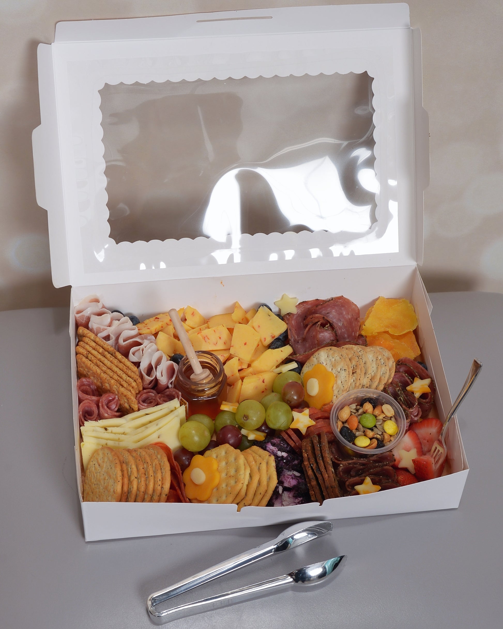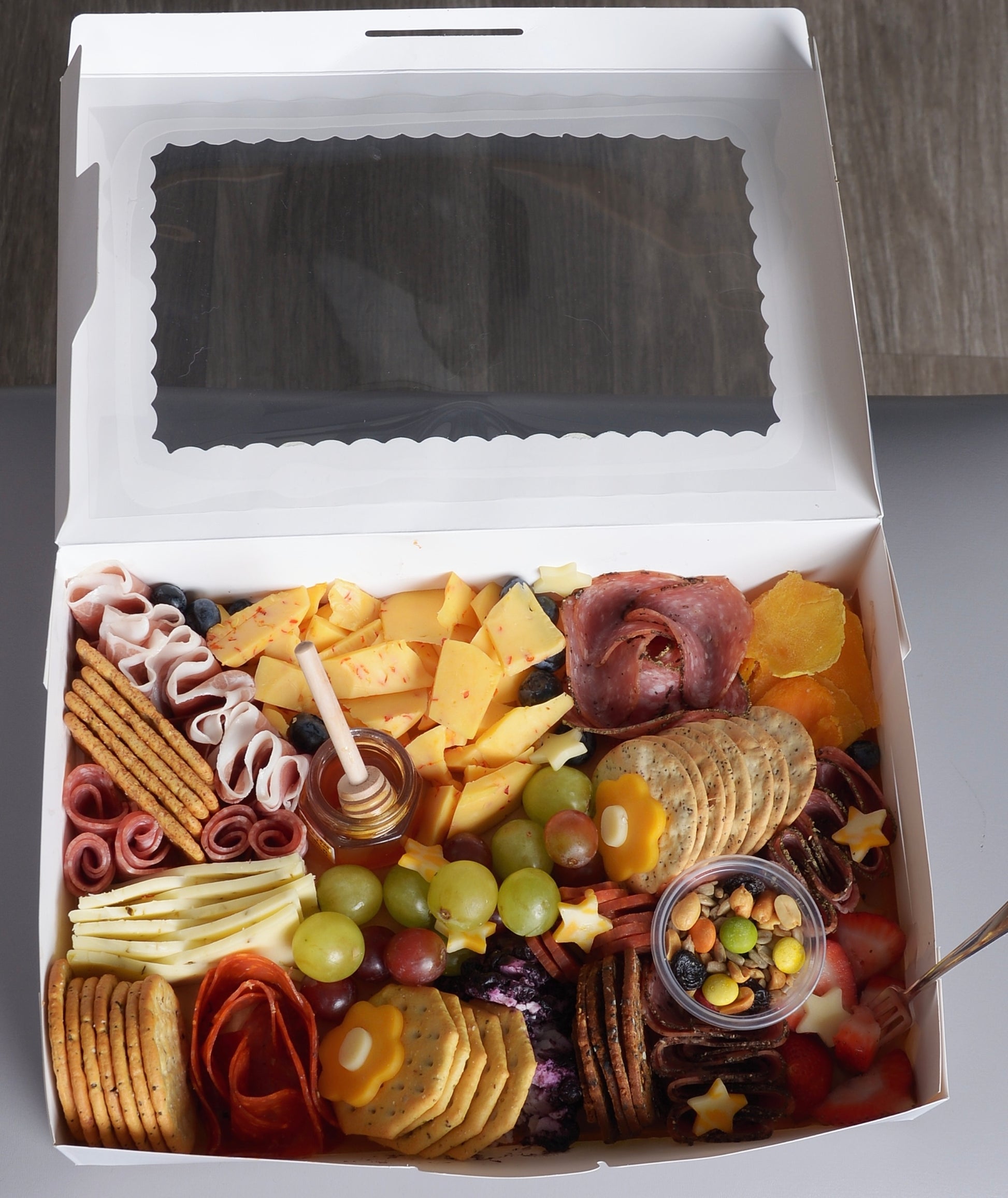 Our Small Classic Charcuterie, features an array of premium meats, cheeses, fruits, nuts, sweets, crackers and condiments. Choose a nut-free option for a personalized gourmet experience. Perfect for any small gathering, this spread offers a delightful mix of flavors and textures.